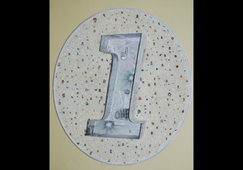 Mix media composition (collage - acrylic - metal - lighting around the edges) - 38"X33"